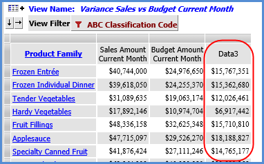 Here is the view before the caption for the calculated measure item is customized. The caption is currently the default, which is the name of the calculated measure item – in this case Data3.