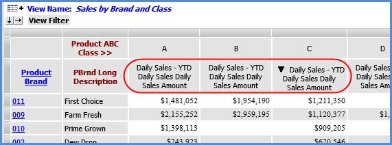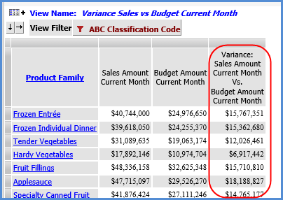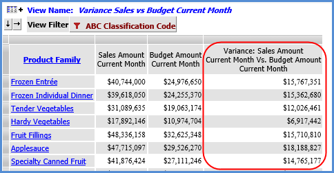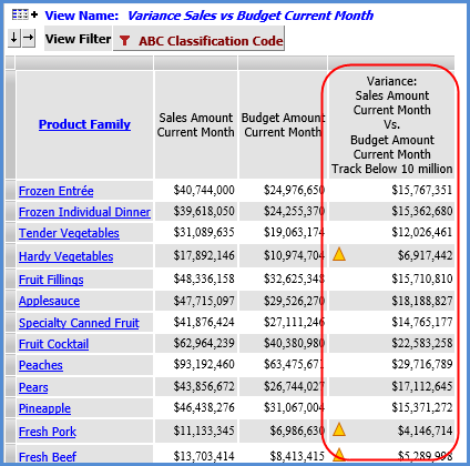 Next is the same calculated measure item with a conditional format applied to it. The conditional format is named Track Below 10 million and it displays a yellow arrow when the variance is below $10,000,000. The next example shows the grid after the caption expression was edited to include the Conditional Format Name variable in the expression.