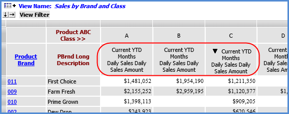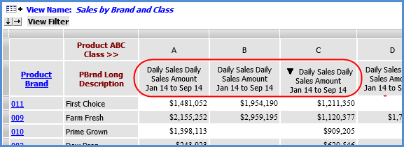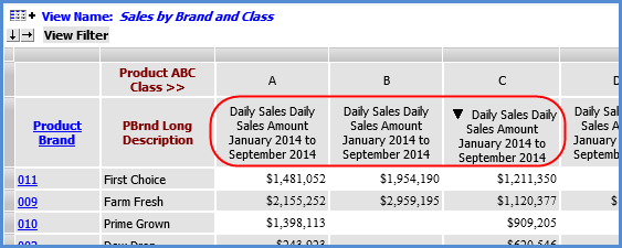 Here are some examples of caption expressions that were set up for the measure item and what each executed caption looked like in the view. In these examples, the current year is 2014 and the current month is September. The time elements in the evaluated captions reflect that current state of the data. Variables are the parts of the expressions that have brackets [ ] around them.