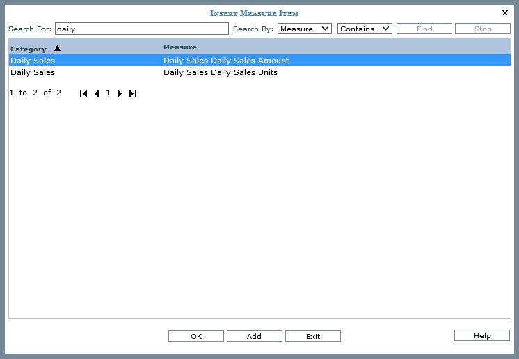 Here are the properties for a measure item without time ranges. This measure item also is based on the Daily Sales Daily Sales Amount measure from the Daily Sales category.