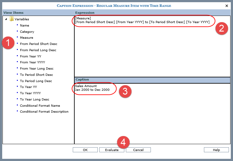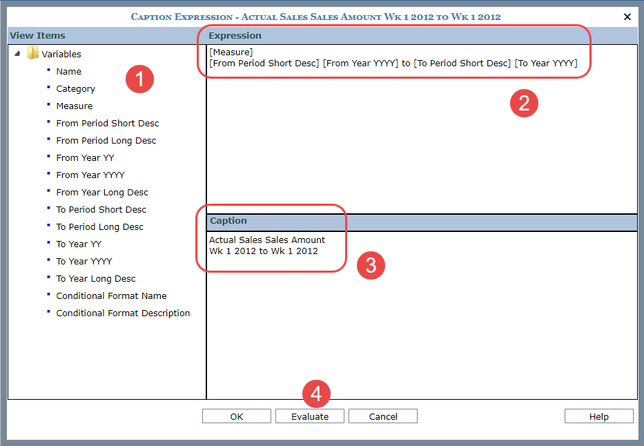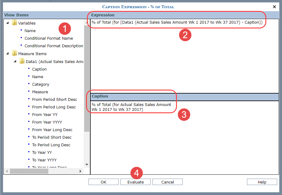 Here’s an example of the Caption Expression window when you are working with a regular measure item. Descriptions of the key parts of the window follow this image.