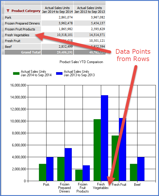 Data points are items of information to chart about each series. Data points can be created from either the rows or columns of the grid. In this chart the Date Points, Fresh Vegetables, Pork, Beef, Fresh Fruit, Frozen Fruit Products, and Frozen Prepared Dinners are from the rows of the grid. The series Actual Sales Units 2014 and Actual Sales Units 2013 are from the columns.