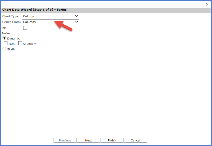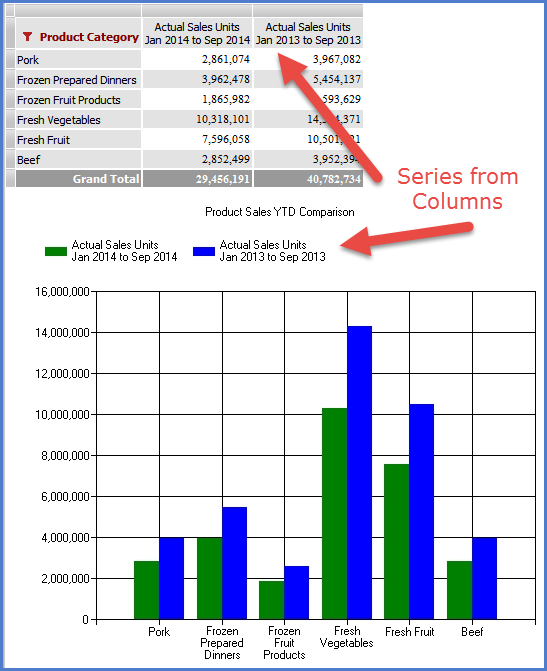 Series are a group of related items (data points) that are included in a chart. Series can be created from either the rows or columns of the grid. In this chart, the Series, Actual Sales Units 2014 and Actual Sales Units 2013 are from the columns of the grid. The data points, Fresh Vegetables, Pork, Beef, Fresh Fruit, Frozen Fruit Products, and Frozen Prepared Dinners are from the rows of the grid.