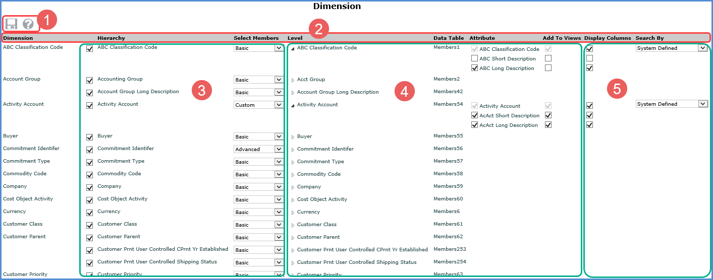 The following settings are used to control which hierarchies are available in views and what type of Select Members search window shows by default while setting up certain types of filters for the applicable hierarchies. Hierarchies And Checkboxes To Control Their Availability – The checkbox next to a dimension’s hierarchy controls whether the hierarchy and its level(s) will be available to use in views.