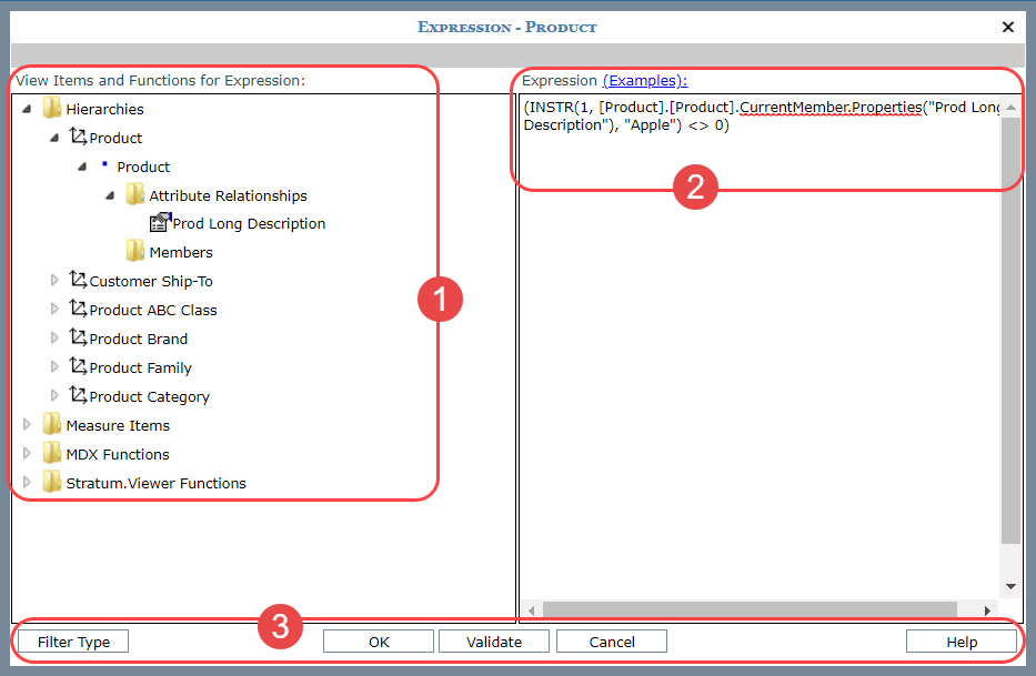 MDX Functions Folder – A Functions folder provides you with logical, member, numeric, set, Stratum.Viewer-specific, tuple, and VBA functions that can be used for building the filter expression. You can select a function by clicking, double clicking, or drag and drop. You can also key in a function directly in the Expression portion of the window.