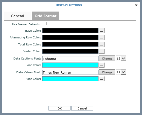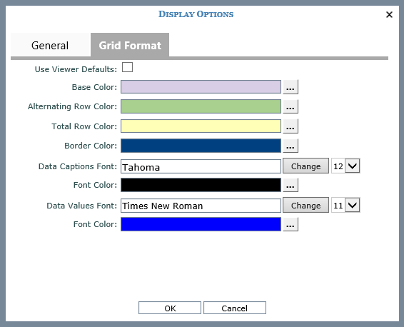 Finally, the user sets the formatting properties to Use Viewer Defaults. This setting adjusts the grid to use the default view look that the Viewer administrator has set up for the application.
