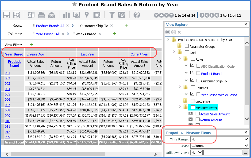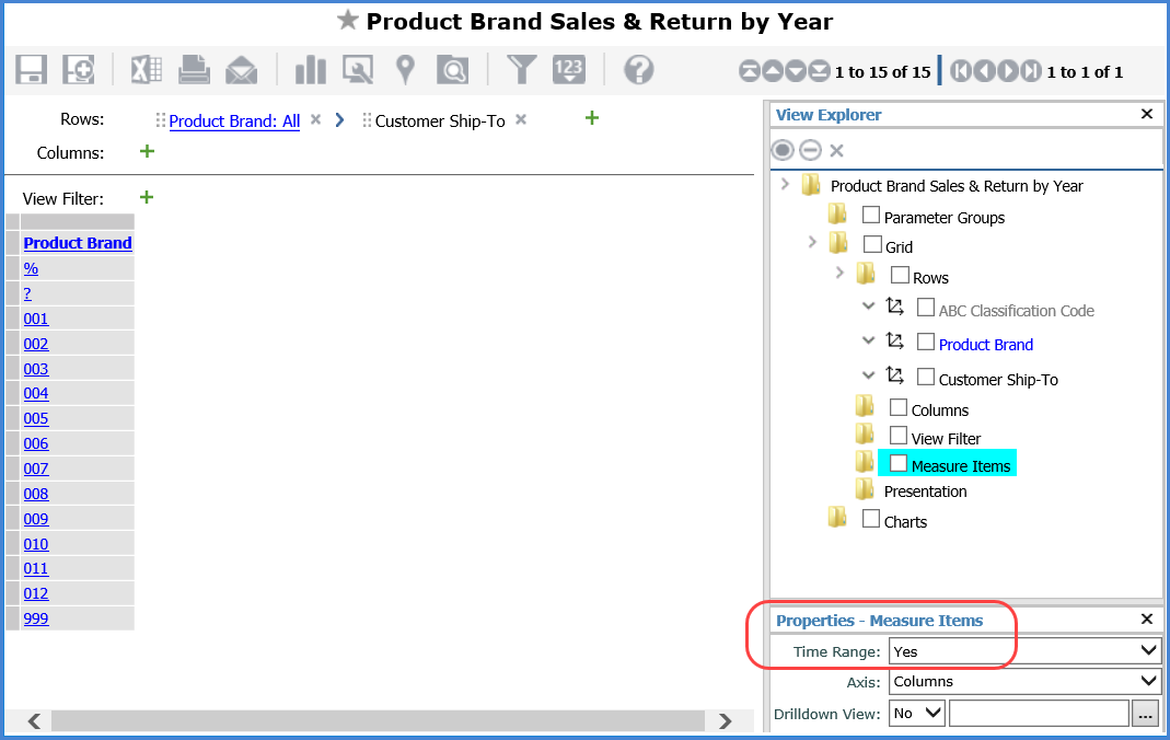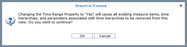 Here is the view after the Time Range property was changed to Yes, and here is the related prompt that displayed to confirm the change. Time hierarchies were removed, as were all measure items (they did not have time ranges). Measure items with time ranges can be added to the view after this change to the Time Range property.