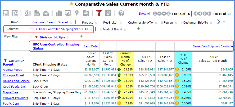 The following view contains a level on columns which belongs to a hierarchy that was created from a User Controlled Attribute. It is the first level on columns, named UPC User Controlled Shipping Status.