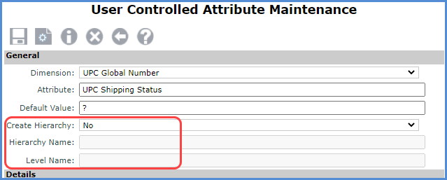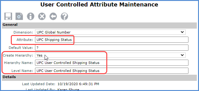 Here is the UPC Shipping Status User Controlled Attribute on which the hierarchy and level are based. The Create Hierarchy property was set to yes and names were defined for the hierarchy and level to create them.