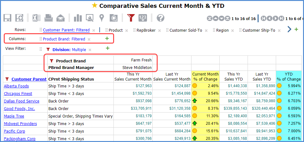 Here is the view reflecting the change after it has been processed. The UPC User Controlled Shipping Status level that showed on columns in our example view does not show on columns anymore and is no longer available to add to any other views. The Product Brand level that used to be the second available level on columns in this example is now displaying as the first and only level.