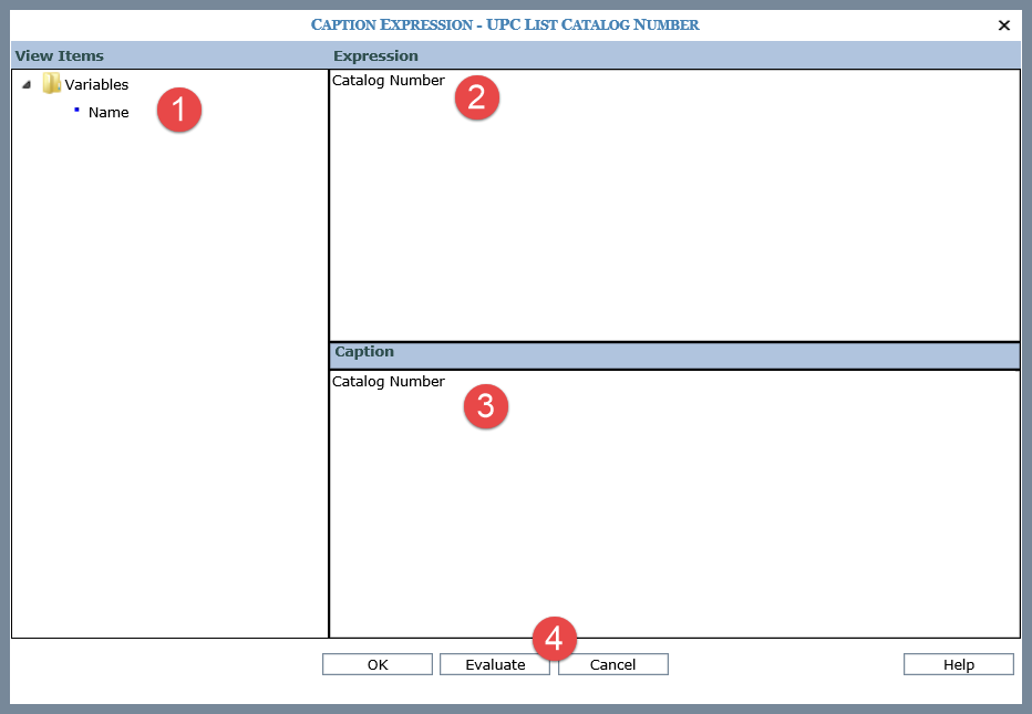 Caption – Displays the evaluated caption so you can verify what the caption will look like. This area is updated when Evaluate is clicked. |