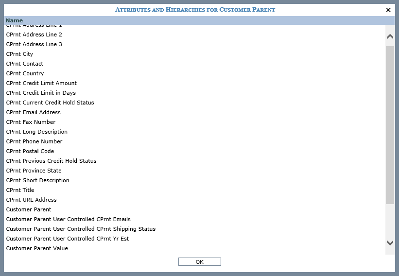 This window shows all attributes and hierarchies that exist for a dimension. The window is accessible when you are working with a User Controlled Attribute in the User Controlled Attribute Maintenance window. The attributes and hierarchies for a dimension must have unique names. This window helps you plan out names for new attributes and hierarchies by seeing the names already used for the dimension’s existing ones.