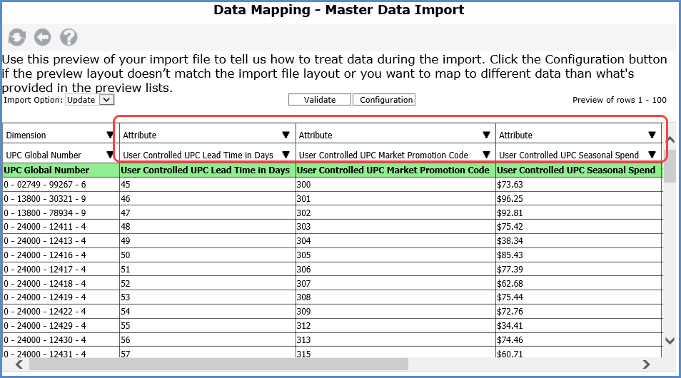 Yes, if the User Controlled Attributes belong to the same dimension. Your import file can handle importing data for more than one attribute for the same dimension. In the following example, data is being imported into three attributes for the UPC Global Number dimension.