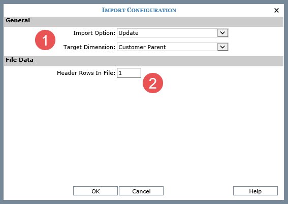 File Data – Make selections about how your file is set up. Use Header Rows In File to specify how many header rows are in the import file. Header rows contain descriptive details that aid you in mapping but do not get imported. For example, the row(s) contain dimension names, descriptions, or attribute names. |