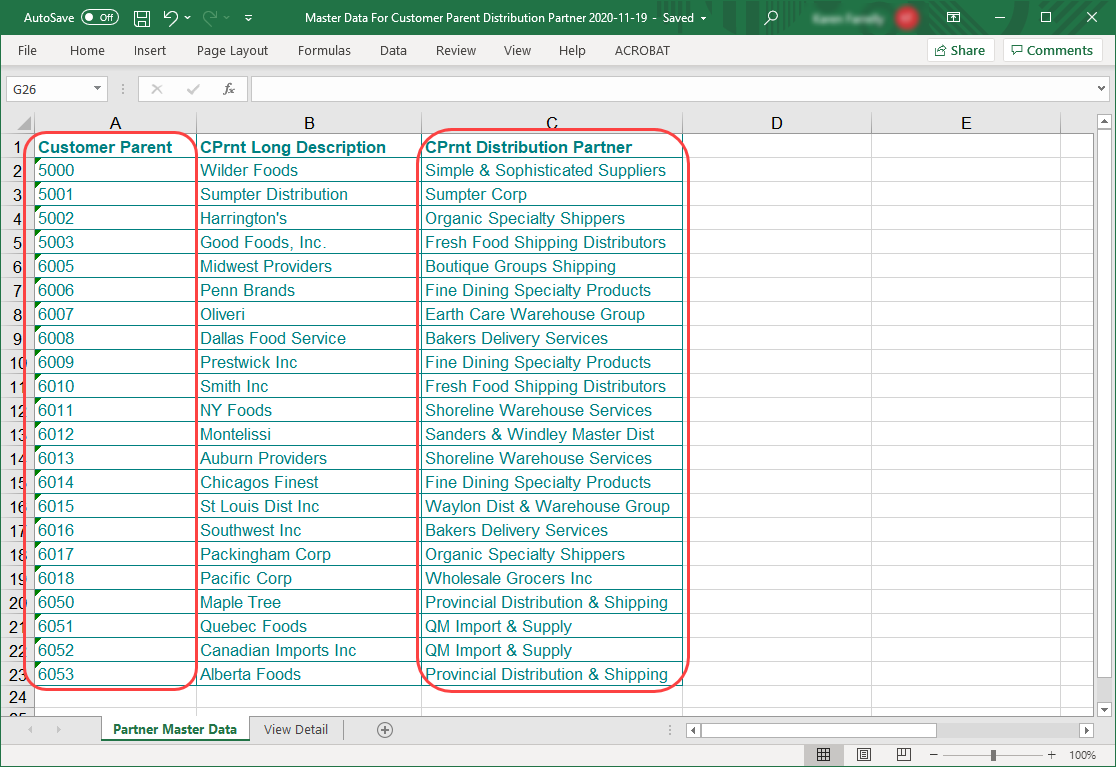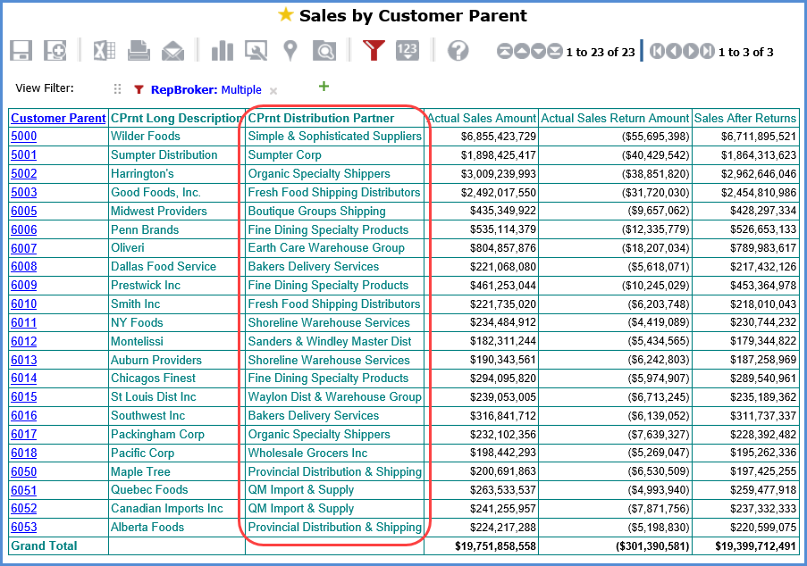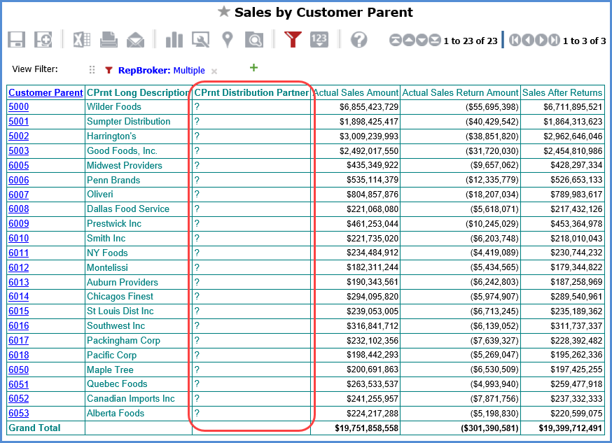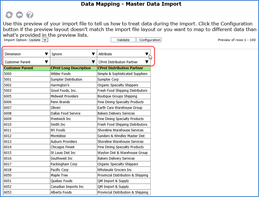 This view contains a “Distribution Partner” User Controlled Attribute that was created for the Customer Parent dimension. This example will show master data being imported to populate the attribute with data.