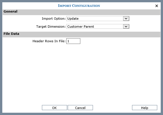 After choosing the Excel file for the import, the user provides basic import configuration details including which dimension to use in the import.
