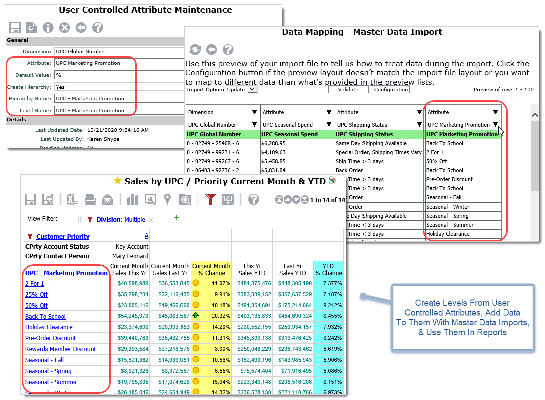 User Controlled Attributes gives you the ability to define and populate master data that supplements existing core Stratum data. Add new attributes on-demand that can be used to describe Stratum dimensions and support new levels of data summarization – as done in the example below. A new attribute for the UPC Global Number dimension had a hierarchy created for it, which is then used in the rows of a YTD sales report. Master Data Import is used to update those attributes with current data and is a quick way to add new dimension key values into the Stratum Data Hub. Security built into the Data Hub maintains the integrity of attributes originating from corporate business systems while keeping track of the separate incoming streams of data for User Controlled Attributes.