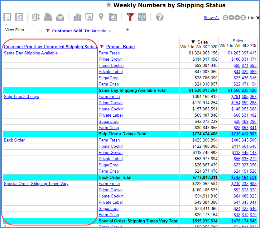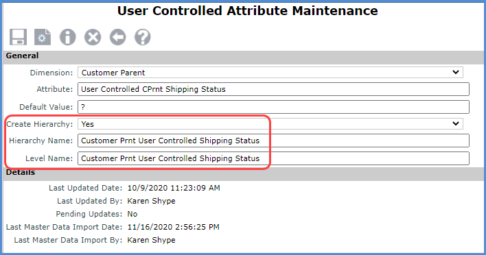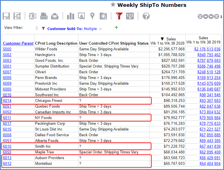 Default Values Show For User Controlled Attributes Until You Import Master Data –The default value assigned to a User Controlled Attribute at the time you created it will display for all of its members that do not yet have master data. As you begin importing master data for them, the default value members will be replaced with your imported data. In the following example, the User Controlled CPrnt Shipping Status attribute has had master data imported for some but not all of its members. The default value assigned to the attribute was a question mark ?. The five members displaying that mark are ones for which master data has not been imported yet.