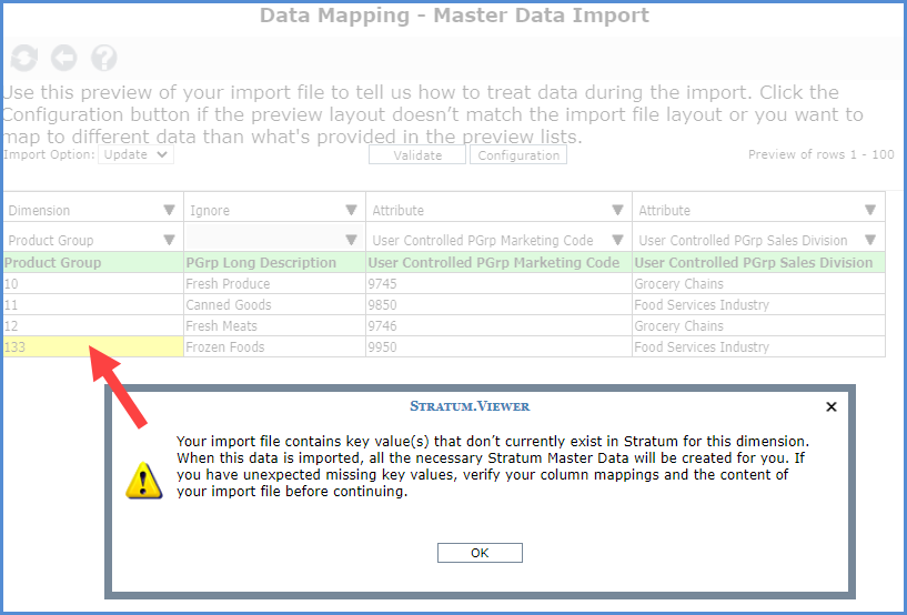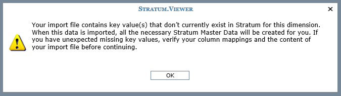 If your import file includes dimension key values that don’t currently exist in Stratum, you will get the following message. It tells you “Your import file contains key value(s) that don’t currently exist in Stratum”. Key values are unique identifiers of the members belonging to your Stratum dimensions.