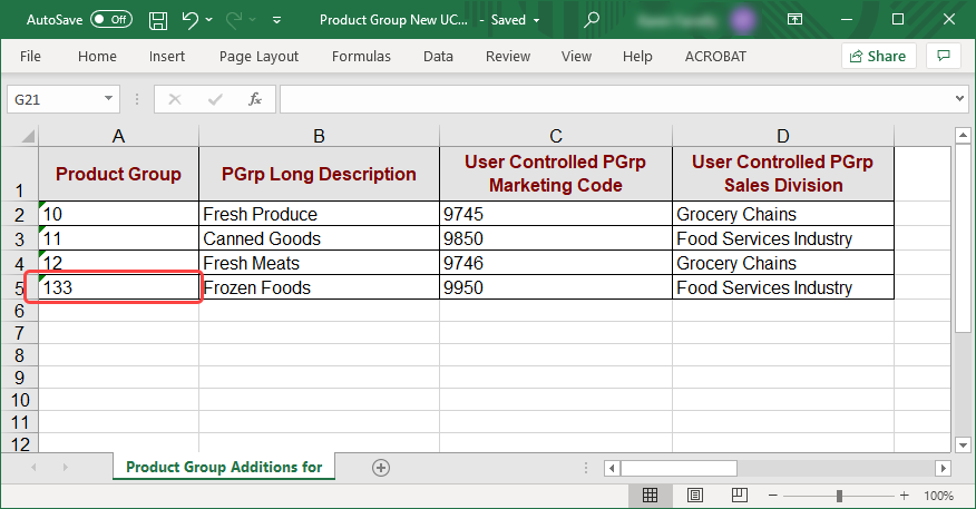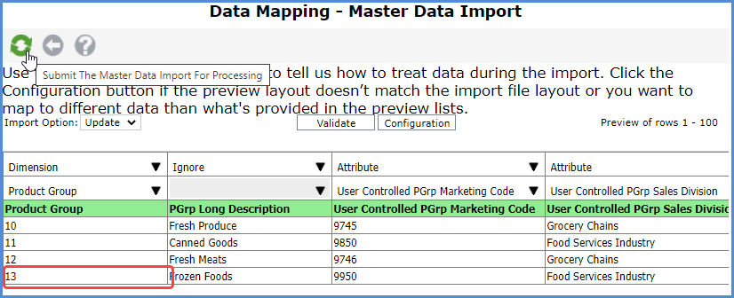 Here’s an example where a user didn’t intend to include a new key value. The dimension Product Group has four members 10, 11, 12, and 13. The user set up some User Controlled Attributes for the dimension and wants to import some data for them using the following import file. The last row was intended to be for existing key value 13, but there is a typo which makes the value there 133. Master Data Import will treat that value as a new key value. The user needs to correct the value to 13 and then try the import again.