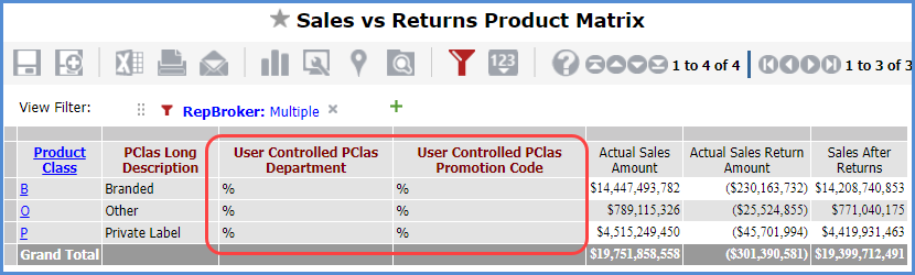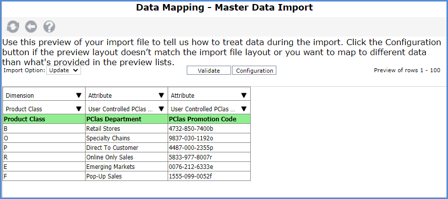 This view shows all existing members (key values) for the Product Class level and two new User Controlled Attributes for the level. The default value of “% displays for the attributes because no master data has been imported yet. Data will be added with a Master Data Import.