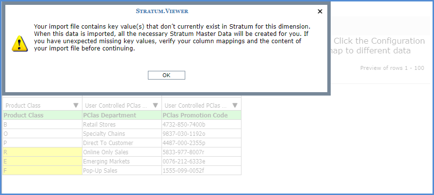 The user maps the data and proceeds with the import, still overlooking the new key values in the import file and that displayed in the mapping window. They also ignore an import validation message that tells them to check their import file if they did not intend to add new key values.