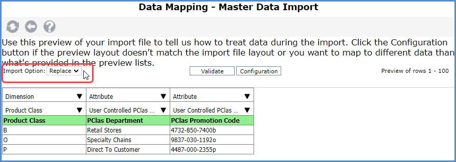 Care should be taken when using a Replace since it removes data for all of a dimension’s User Controlled Attributes. If there is existing data you don’t want to lose, then set the import configuration to Update instead of Replace.