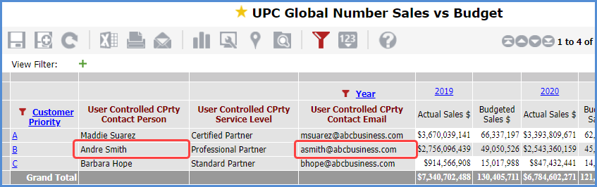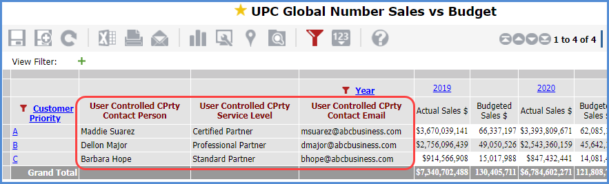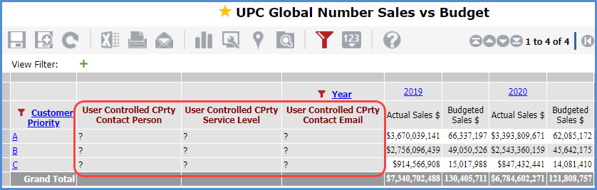 This view has three new User Controlled Attributes for the Customer Priority level. Their default value of “?” displays because no master data has been imported yet. Data will be added with an Update type of Master Data Import.