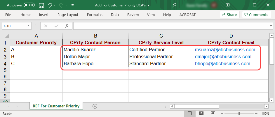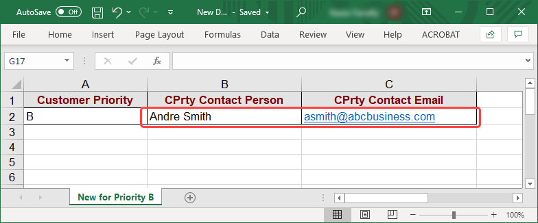 The contact person and email attributes for Priority B need to be changed at some point after the initial import. This import file shows the new data for Priority B.