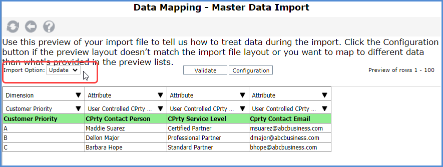 An Update is the more common type of import. It’s the default configuration for Master Data Imports. An Update will update existing data and add any new data included in the import file.