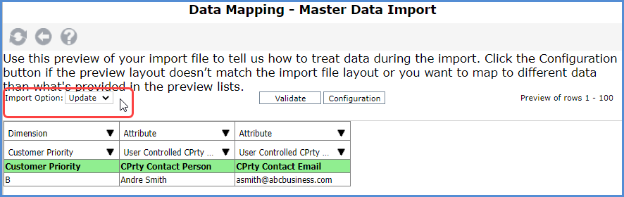 The import data is mapped to the appropriate attributes. Import Option is left at the default of Update.