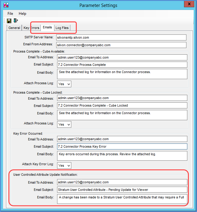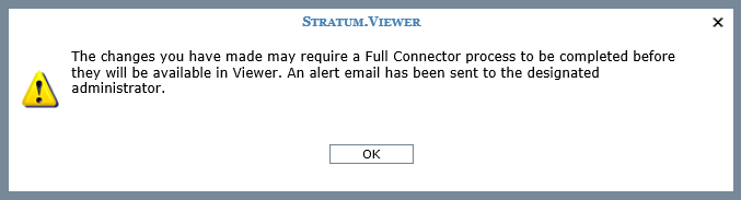 You will receive that type of email if related Stratum email settings identify you as a recipient for that type of notification. The email is sent out when someone adds a new User Controlled Attribute or changes an existing User Controlled Attribute. The email helps tell the recipients, typically your Stratum.Connector administrators, that changes exist and a Full process may be needed to update Viewer with the changes. The last image below shows the Parameter setting window in Connector where this type of email notification is controlled. The recipients, email subject, and email body text are set up in that window.