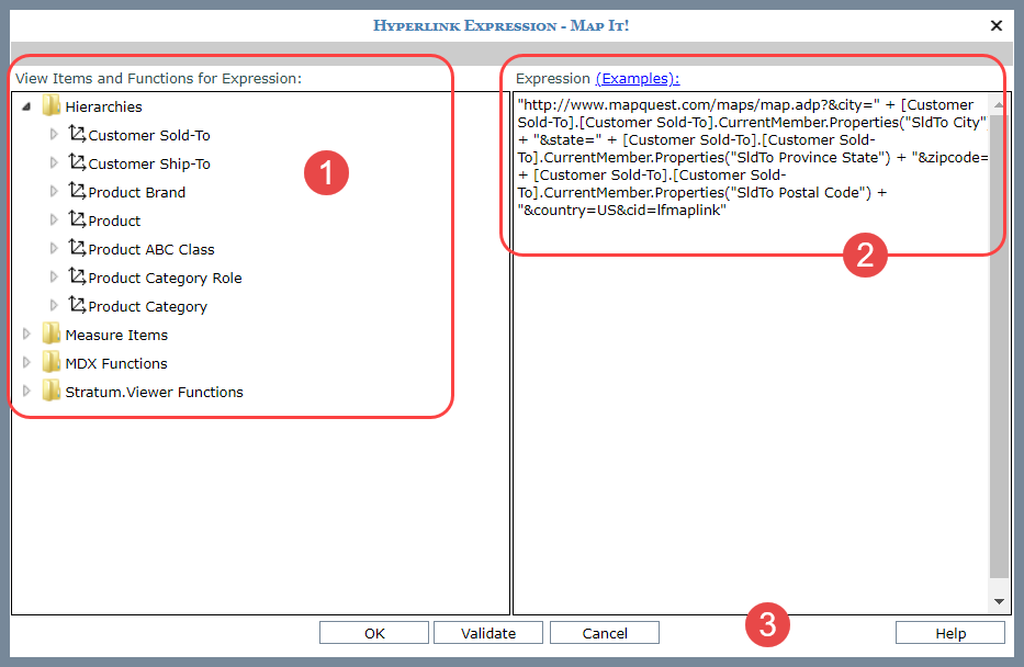 OK – Click to validate your hyperlink expression and close the window. Validate – Click at any point while you are building the expression. Stratum.Viewer will verify whether or not the format of your expression is valid. Blank is not a valid expression. Cancel – Click to close the window without making any changes. Help – Click to open help about this window. |