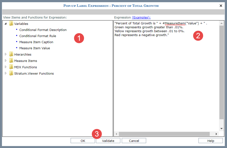 View Items and Functions for Expression – Use the view items and functions to define your pop-up label expression by clicking on or dragging and dropping the item into the Expression area. The conditional format name, description, and rule can be included in the pop-up label, as well as the caption and value of the associated measure item. The hierarchies, attribute relationships, and measure items associated with the view can be included in the pop-up label. You can also key static text directly into the Expression portion of the window. Note: If you use the Conditional Format variables in an expression and no conditional format exists for the measure item, then three blank spaces will display for the variables in the resulting pop-up label. The same is true for Conditional Format Rule variables in use in cases where a rule for the corresponding conditional format would produce a null value for the measure item. MDX Functions and Stratum.Viewer Functions – The MDX Functions folder provides you with numeric, member, date, tuple, and other functions that can be used in building the expression. The Stratum.Viewer Functions folder contains Viewer-specific functions that can be used for building the pop-up label expression. |