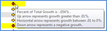 Examples follow. See Define Pop-up Labels for Measure Items for more examples. Note: See also Cell Formatting with Conditional Formats, Hyperlinks, Drilldown Views, and Pop-up Labels. A pop-up label can be used to display the measure item value when value is set to “No”. For example: #MeasureItem("Value") will display the measure item value when the user hovers over a conditional format icon. A pop-up label can be used to display the measure item value and conditional format rules. For example: "Percent
