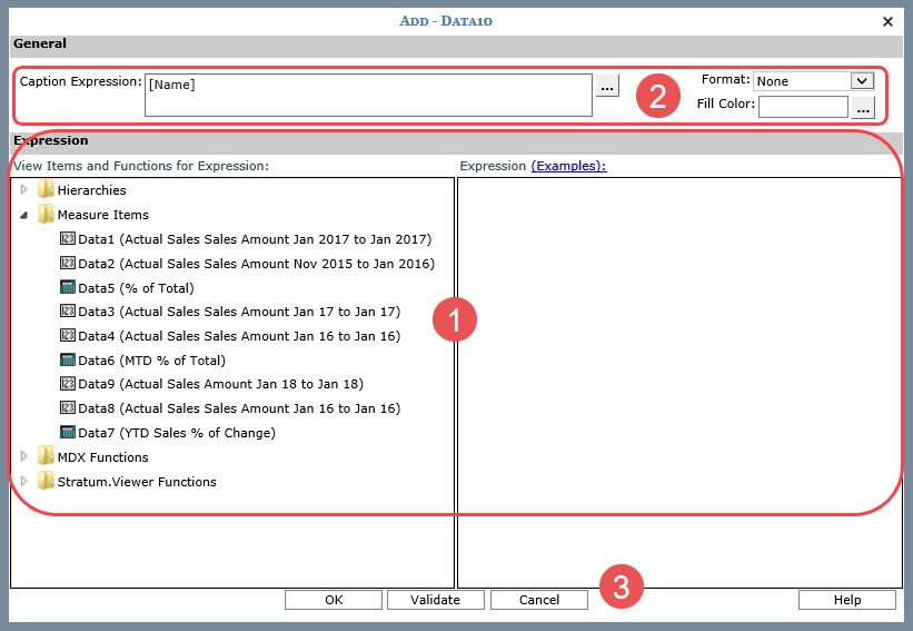 Validate – Click the Validate button at any point while you are building the expression. Stratum.Viewer will verify whether or not the format of your expression is valid. If you do not click the Validate button while building the expression, then validation will be performed once you click the OK button. OK / Cancel – Click OK to add the measure item or Cancel to discard the measure item you were setting up. Help – Click Help or the Examples link in the Expression section to access example expressions for calculated measure items. |