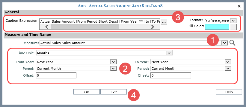 General Section – Use this section to set up a custom caption for the measure item and to select a format or fill color for it. Caption Expression – Clicking the Browse