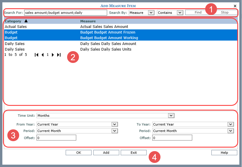 Search section - Use the Search For field and values in the Search By drop-down list to narrow down the measures displayed in the window. Search using one or more criteria separated by semicolons (;) and by the category or measure. Additional search specifications can be associated with the search, for example, Contains, Greater Than, or Not Equal To. |