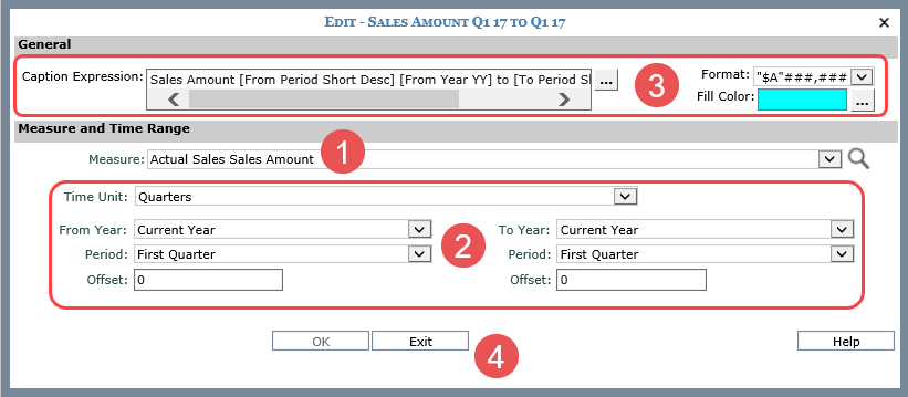 General Section – Use this section to edit the measure item caption, format, or fill color. Caption Expression – Clicking the Browse