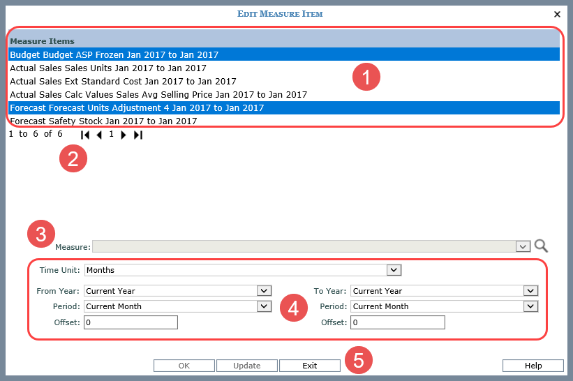 OK / Update / Exit - OK applies the edits and closes the window. Update applies the edit but leaves the window open so you can edit other measure items. Exit closes the window without making any edits. |