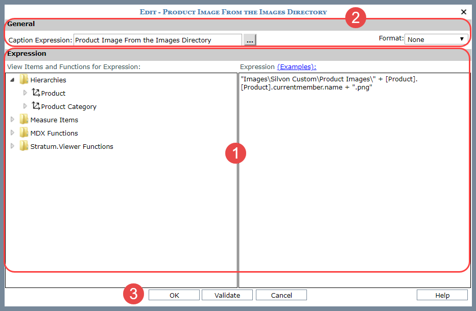 Expression Section – Use this part of the window to set up or edit the expression for displaying an image for a measure item in the view. You can use objects from the View Items and Functions for Expression portion of the window or type directly in the space provided on the right side of the window. Objects available to work with include hierarchies, levels, attribute relationships, and measure items that are part of the view definition. See the topic Display Images for Measure Items, which shows examples of expressions that display images for measure items in views. |