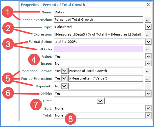 Type – This property shows the type of measure item you are working with – either regular, calculated, or distinct calculated. The property will be set to “Calculated” or “Distinct Calculated” if you are inserting or editing that type of measure item.
