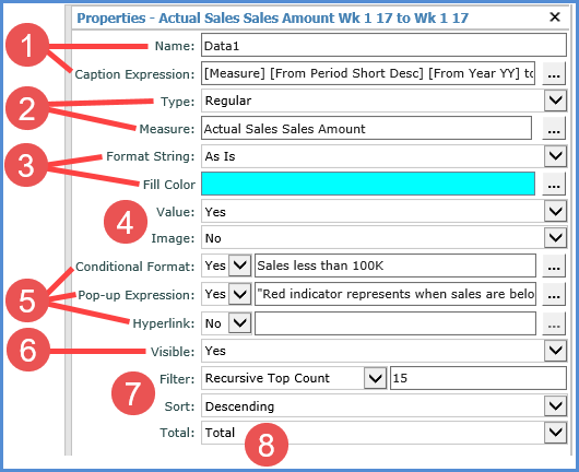 Image – This property is used when setting up calculated measure items that display images. You use the Expression window to define the location of the image and then set this property to Yes in order for the defined image to display in the grid. See item 2 above and also Display Images for Measure Items.
