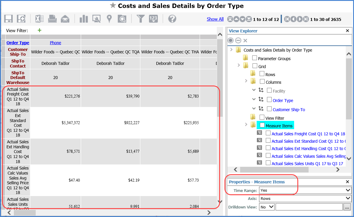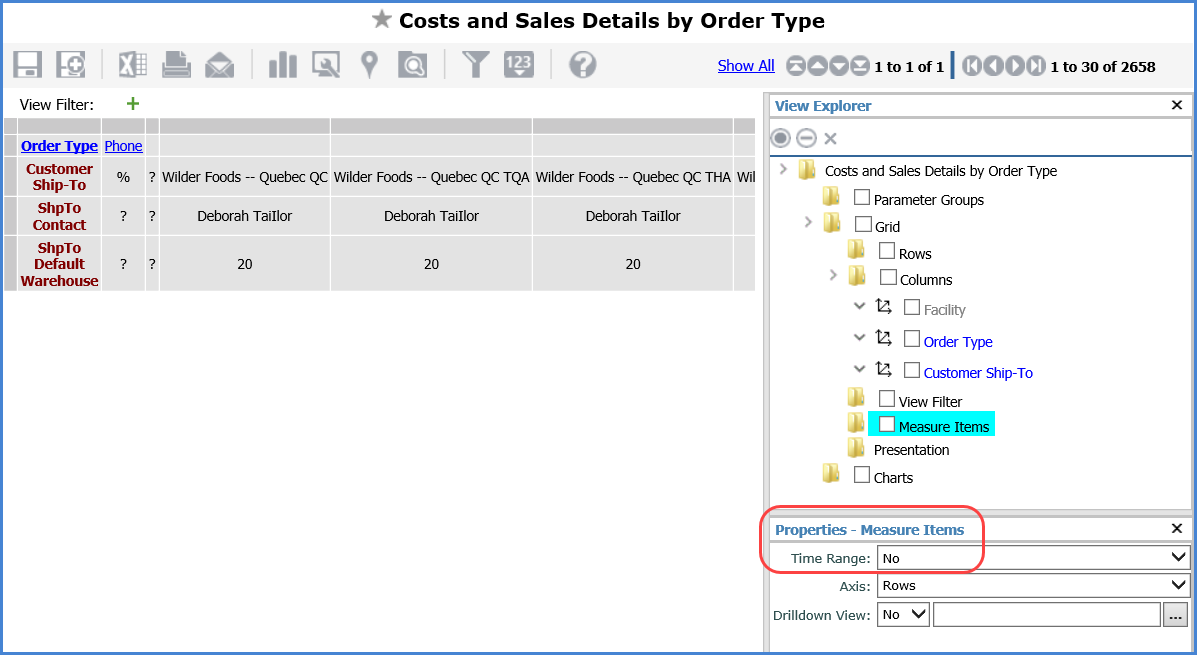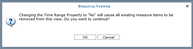 All measure items will be removed from a view if you change the Time Range property. Changing the property to No lets you use time hierarchies in the view. In that case, all measure items (they will have time ranges) will be removed. Changing the property back to Yes lets you use measure items with time ranges in the view. In that case, all measure items (they will not have time ranges) and all time hierarchies will be removed from the view.