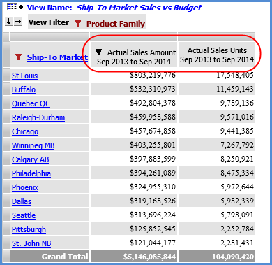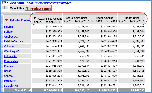 Here is a view run by a user with access to all Actual Sales and Budget measures.