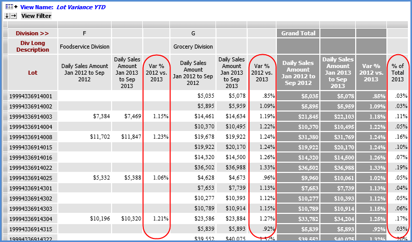 Calculations for a calculated measure item are executed for each member of a level. A calculated measure item with its Distinct property enabled is known as a distinct calculated data item, and the calculations for that type of measure item are executed once for each level rather than individually for each level member. In the following view, Var % YTD 2012vs 2013 is a calculated measure item that is executed for Division F and G. The last measure item, % of Total 2013, is a distinct calculated measure item performed for the overall Division level.