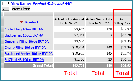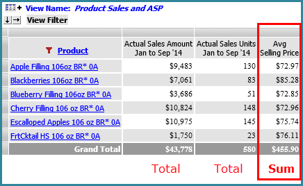 If you had used a Sum total in this case, the Grand Total would be the sum of the Average Selling Price detail values displayed for the six Products in the view. The Total designation is more appropriate than a Sum designation in this case.