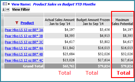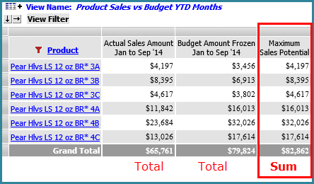 Here is an example where the Sum designation is preferred over Total. The Maximum Sales Potential measure item in the following view is a calculated measure item with an If, Then, Else statement built into it. It displays the actual sales value for a Product if that Product’s sales are greater than its budgeted sales. Otherwise, the calculation displays the budgeted sales value for the Product. The calculation is not applied to generate the Grand Total for the measure item because it has been assigned a “Sum” total. The Grand Total is the sum of the Maximum Sales Potential detail values displayed for the six Products in the view.