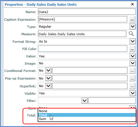 The Sum type of total is intended for special cases where you don’t want any underlying calculations that Viewer performs to generate detail values applied when generating total values. You might choose to use a Sum total when a measure item calculation includes an IIF statement, such as a calculation with IF, Then, Else conditions.