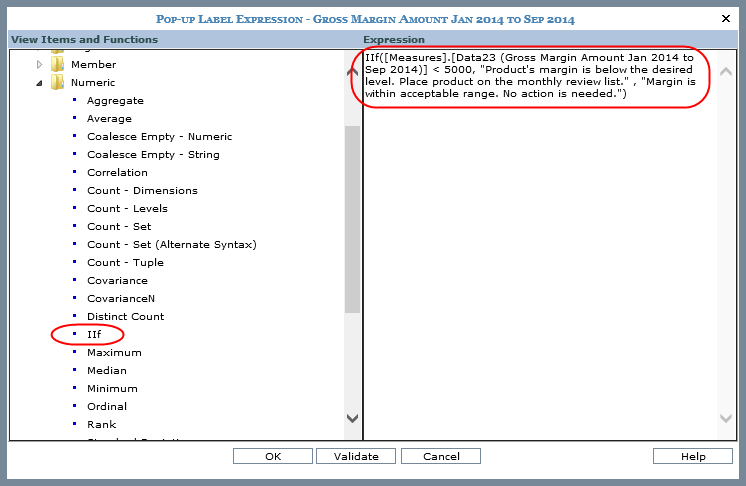 This expression uses the IIf function to define a conditional expression. The label will display one of two statements depending on the conditions in the view grid. If Gross Margin Amount is less than $5,000, the first statement will display. If the margin is greater than $5,000, then the second statement will display.